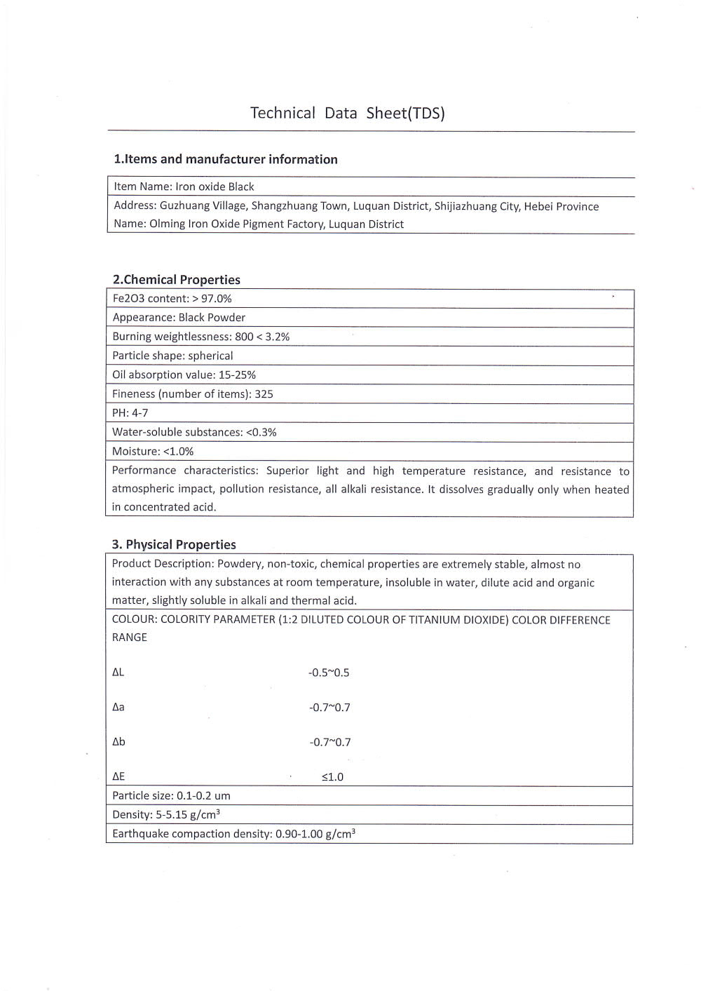 An important inorganic color pigment with high hiding power, strong coloring power, good dispersibility, excellent light resistance and weather resistance, and has a broad market space.3、The advantages of iron oxide black pigment products