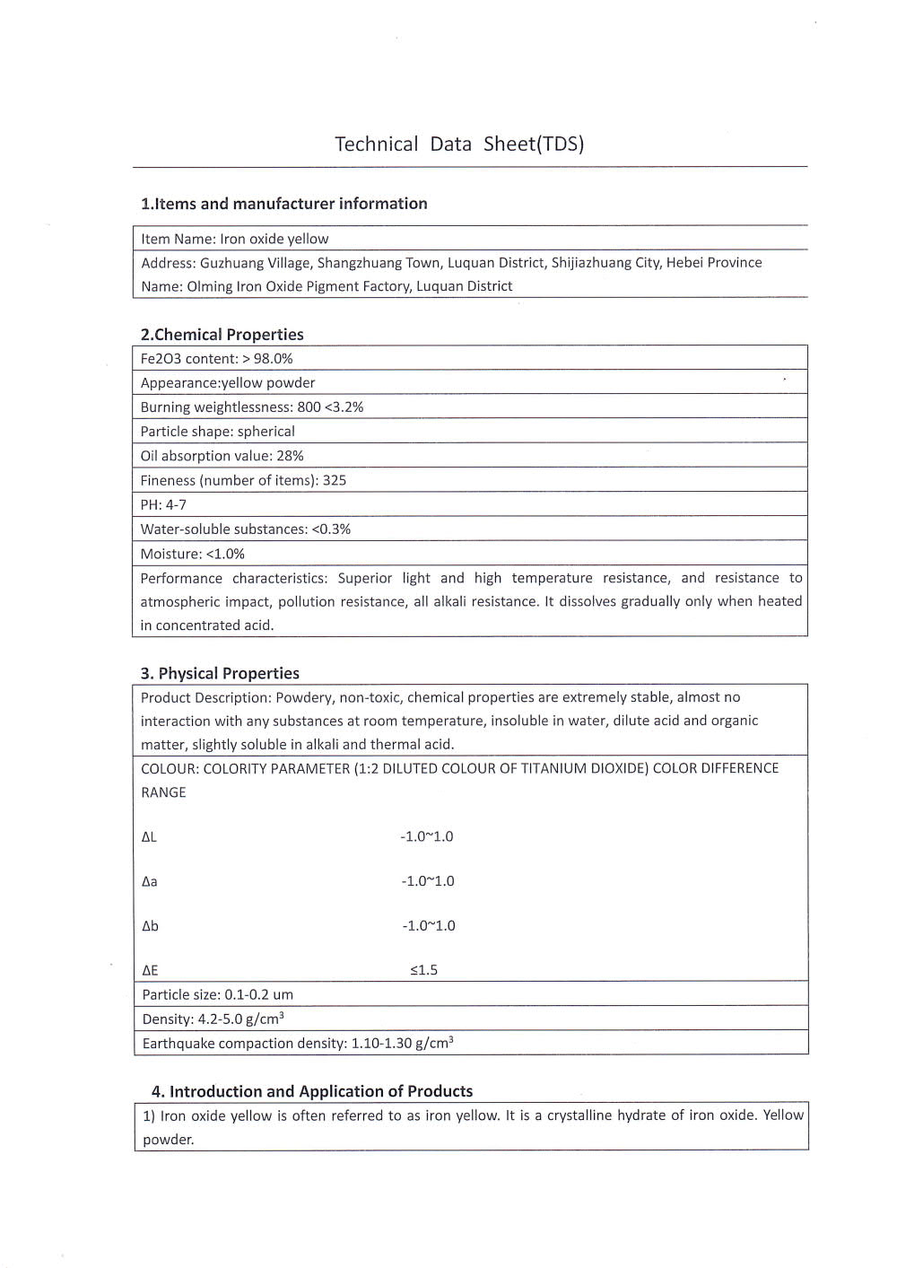 A chemically stable basic oxide whose maximum application is as a pigment, soluble in water, alcohol, and soluble in acid. The color of iron oxide yellow is clear and pure, has high hiding power and strong coloring power, and good dispersibility, and its light resistance, high temperature resistance and weather resistance are very good.3、The advantages of iron oxide yellow pigment products