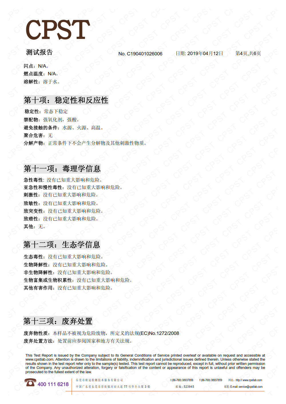 常態時產品性能穩定,如果按要求處理將不會具有危害性。