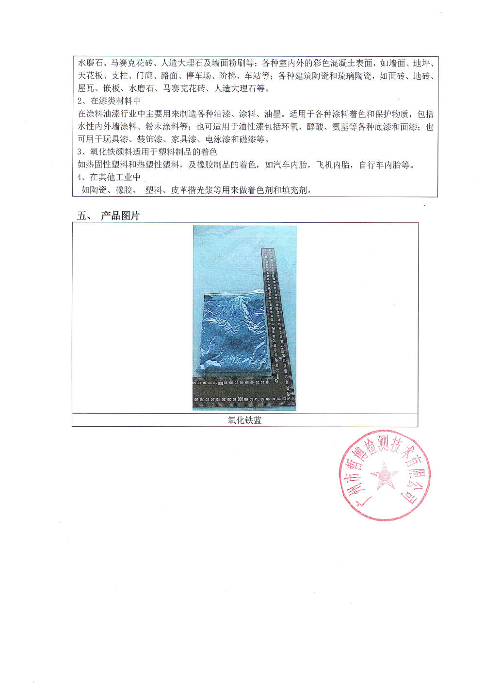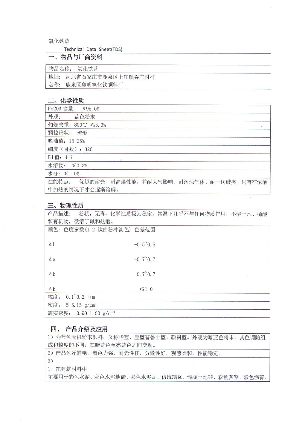 色澤鮮艷,著色力強,遮蓋力略差。粉質較堅硬,耐光性好,耐堿性差,耐熱度較高,溫度超過150度以上失去結晶水開始分解為紅色顏料。三、氧化鐵藍顏料產品優勢