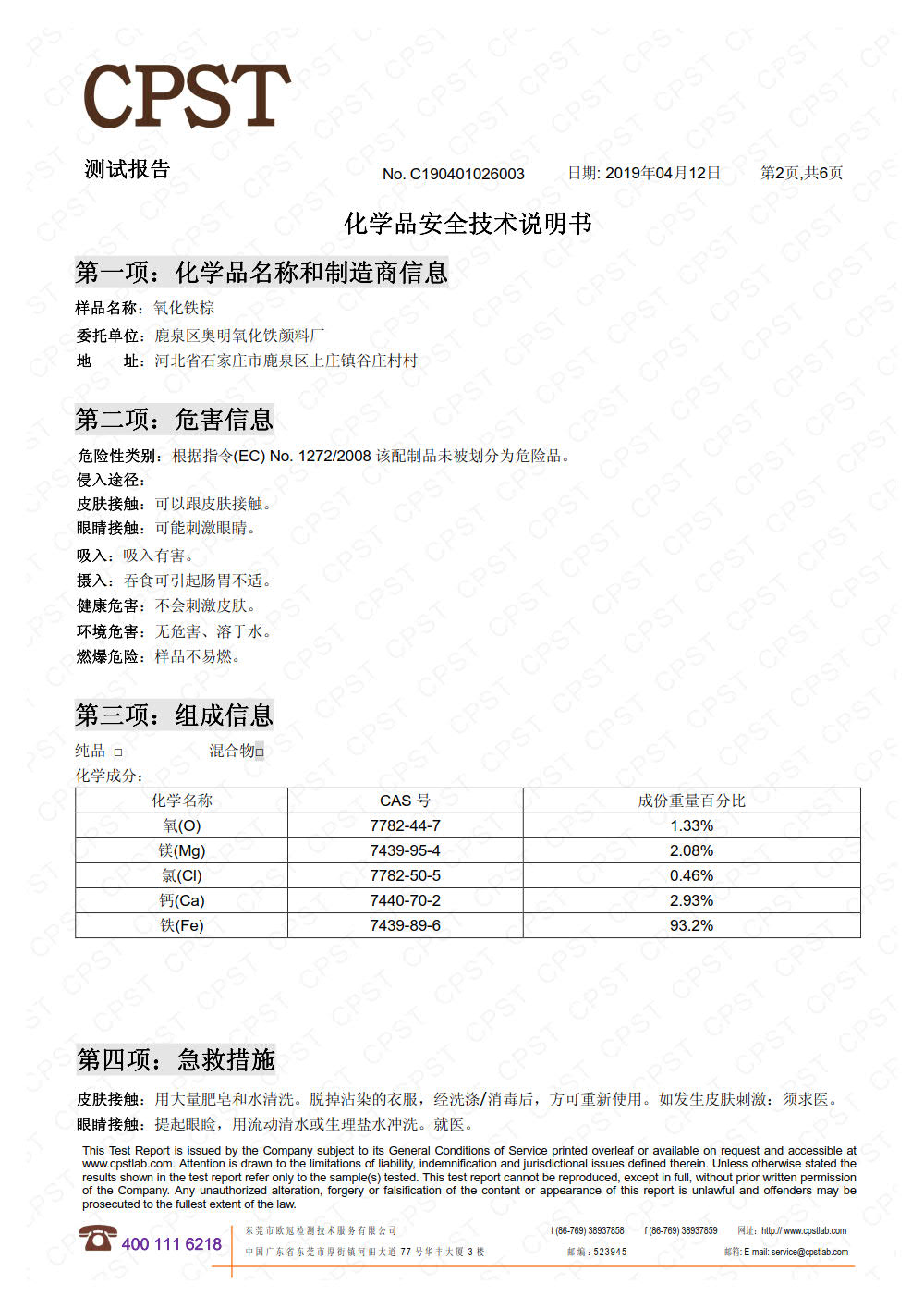 吸入其粉塵會引起塵肺。氧化鐵氣溶膠(煙塵)最大容許濃度為5mg/m3,應注意防塵。七、本公司氧化鐵棕的產品質量把控