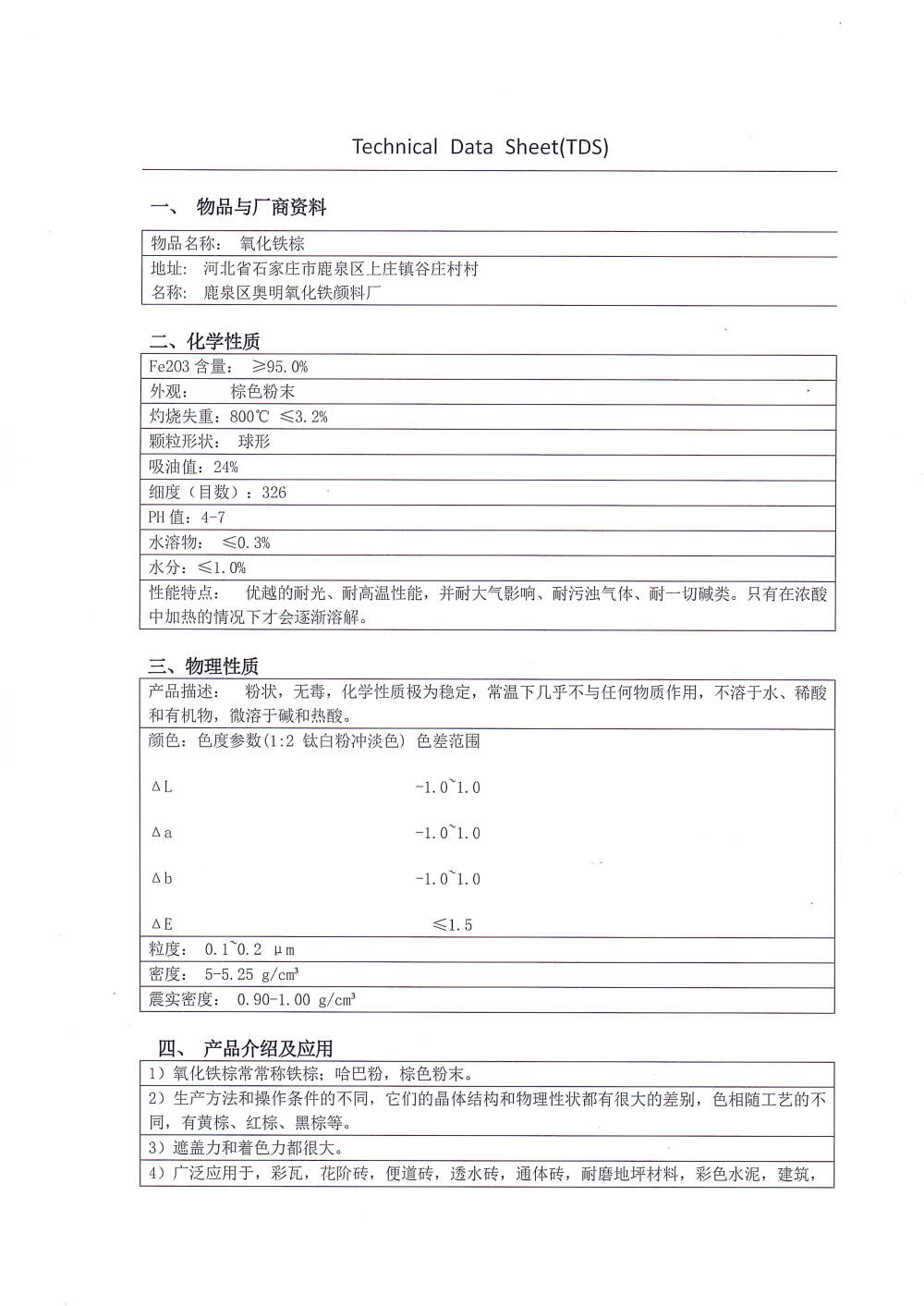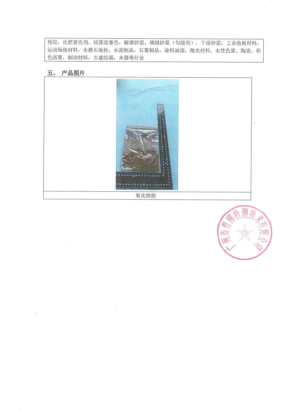 物質特性: 顏色有黃棕、紅棕和深棕系列顏色。具有良好的顏料特性和化學性能,著色力、遮蓋力均很高,耐候、耐光性優異。不溶于堿,在一定的酸度范圍內性能穩定,在濃鹽酸中可完全溶解。